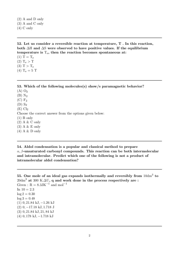 Let us consider a reversible reaction at temperature, T . In this reaction, both \(\Delta \mathrm{H}\) and \(\Delta \mathrm{S}\) were observed to have positive values. If the equilibrium temperature is \(\mathrm{T}_{\mathrm{e}}\), then the reaction becomes spontaneous at:
