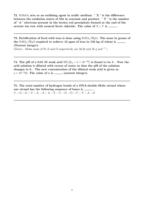 \(\mathrm{KMnO}_{4}\) acts as an oxidising agent in acidic medium. ' X ' is the difference between the oxidation states of Mn in reactant and product. ' Y ' is the number of ' d ' electrons present in the brown red precipitate formed at the end of the acetate ion test with neutral ferric chloride. The value of \(\mathrm{X}+\mathrm{Y}\) is _______ .