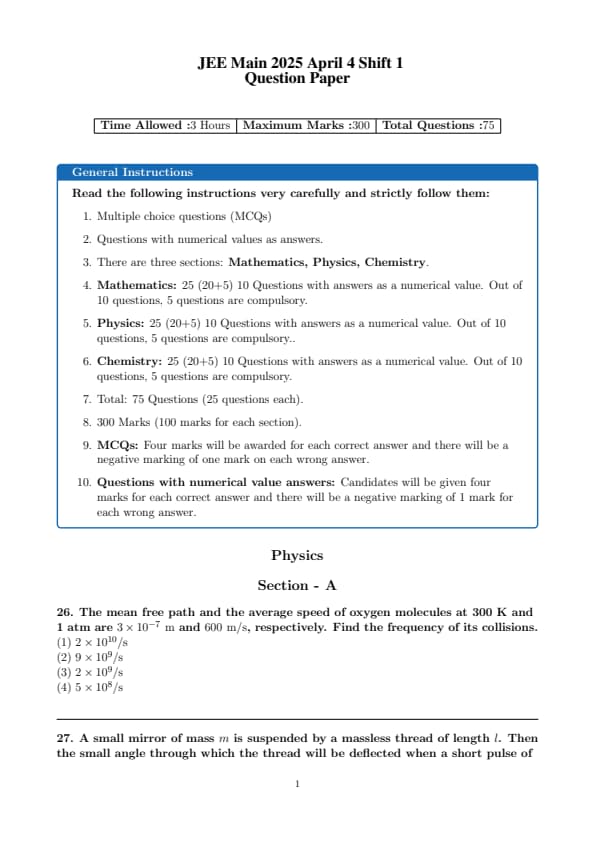 | JEE Main 2025 April 4 Shift 1 Physics Question Paper Pdf | Download PDF | View Solution |