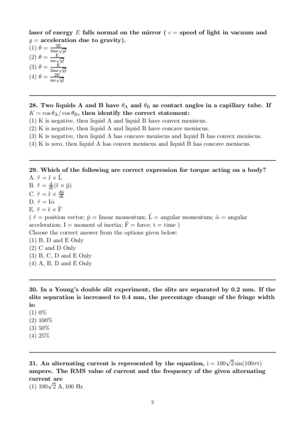 A small mirror of mass \(m\) is suspended by a massless thread of length \(l\). Then the small angle through which the thread will be deflected when a short pulse of laser of energy \(E\) falls normal on the mirror ( \(c=\) speed of light in vacuum and \(g=\) acceleration due to gravity).