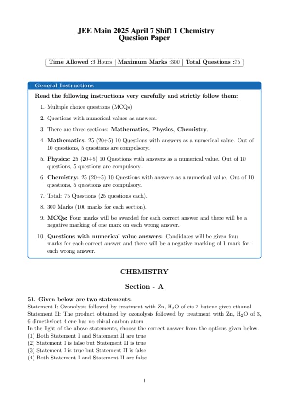 | JEE Main 2025 April 7 Shift 1 Chemistry Question Paper Pdf | Download PDF | View Solution |