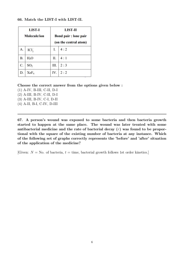 A person's wound was exposed to some bacteria and then bacteria growth started to happen at the same place. The wound was later treated with some antibacterial medicine and the rate of bacterial decay (\(r\)) was found to be proportional with the square of the existing number of bacteria at any instance. Which of the following set of graphs correctly represents the 'before' and 'after' situation of the application of the medicine?