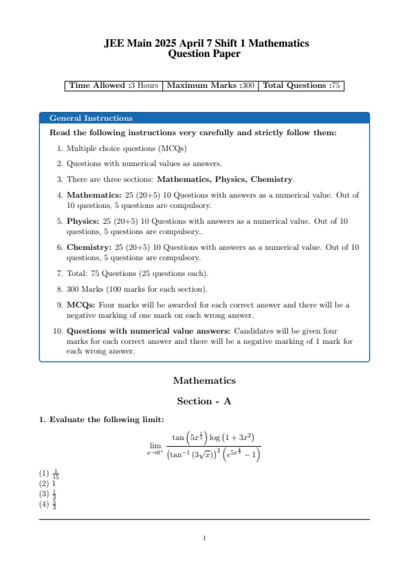 | JEE Main 2025 April 7 Shift 1 Maths Question Paper Pdf | Download PDF | View Solution |