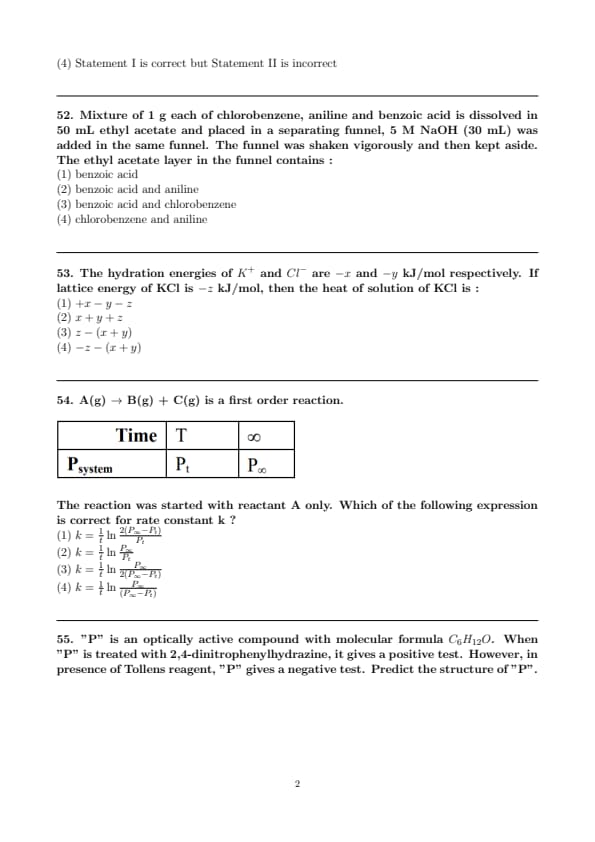 Mixture of 1 g each of chlorobenzene, aniline and benzoic acid is dissolved in 50 mL ethyl acetate and placed in a separating funnel, 5 M NaOH (30 mL) was added in the same funnel. The funnel was shaken vigorously and then kept aside. The ethyl acetate layer in the funnel contains :