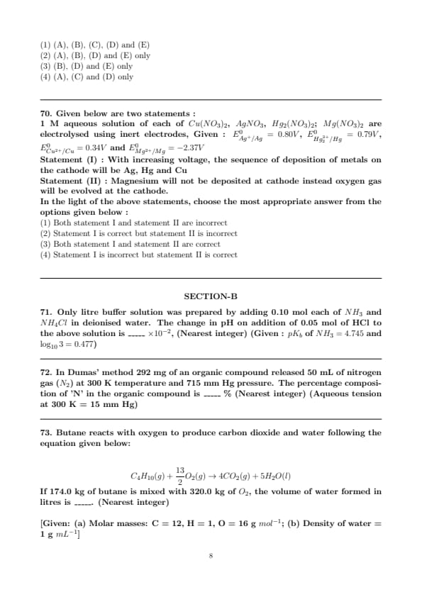 Statement (II) : Magnesium will not be deposited at cathode instead oxygen gas will be evolved at the cathode.