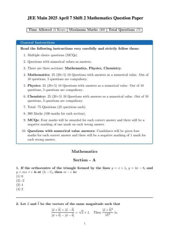 | JEE Main 2025 April 7 Shift 2 Maths Question Paper Pdf | Download PDF | View Solution |