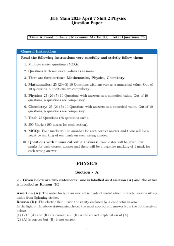 | JEE Main 2025 April 7 Shift 2 Physics Question Paper Pdf | Download PDF | View Solution |