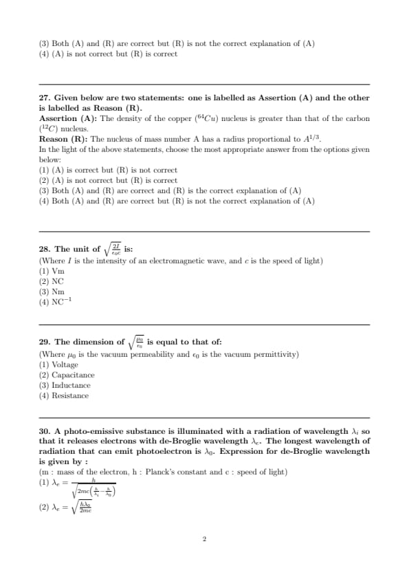 Assertion (A): The density of the copper (\(^{64}Cu\)) nucleus is greater than that of the carbon (\(^{12}C\)) nucleus.