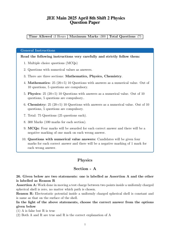 JEE Main 2025 April 8 Shift 2 Physics Question Paper with Solutions