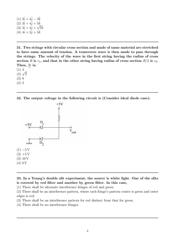 Two strings with circular cross section and made of same material are stretched to have same amount of tension. A transverse wave is then made to pass through the strings. The velocity of the wave in the first string having the radius of cross section \( R \) is \( v_1 \), and that in the other string having radius of cross section \( R/2 \) is \( v_2 \). Then, \( \frac{v_2}{v_1} \) is:
