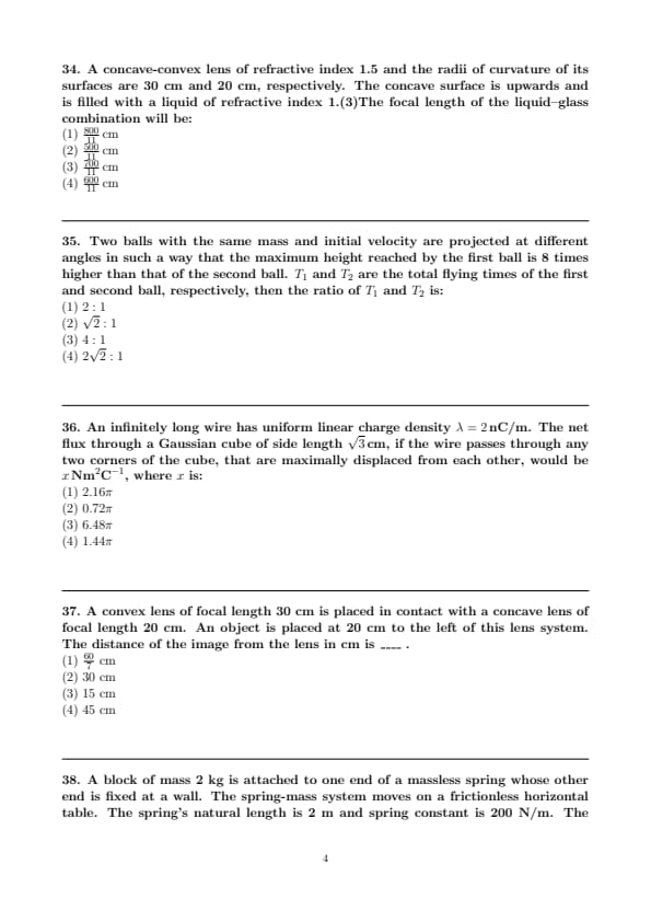A concave-convex lens of refractive index 1.5 and the radii of curvature of its surfaces are 30 cm and 20 cm, respectively. The concave surface is upwards and is filled with a liquid of refractive index 1.(3)The focal length of the liquid–glass combination will be: