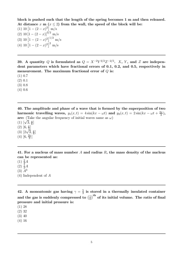 A block of mass 2 kg is attached to one end of a massless spring whose other end is fixed at a wall. The spring-mass system moves on a frictionless horizontal table. The spring's natural length is 2 m and spring constant is 200 N/m. The block is pushed such that the length of the spring becomes 1 m and then released. At distance \( x \) m (\( x \leq 2 \)) from the wall, the speed of the block will be: