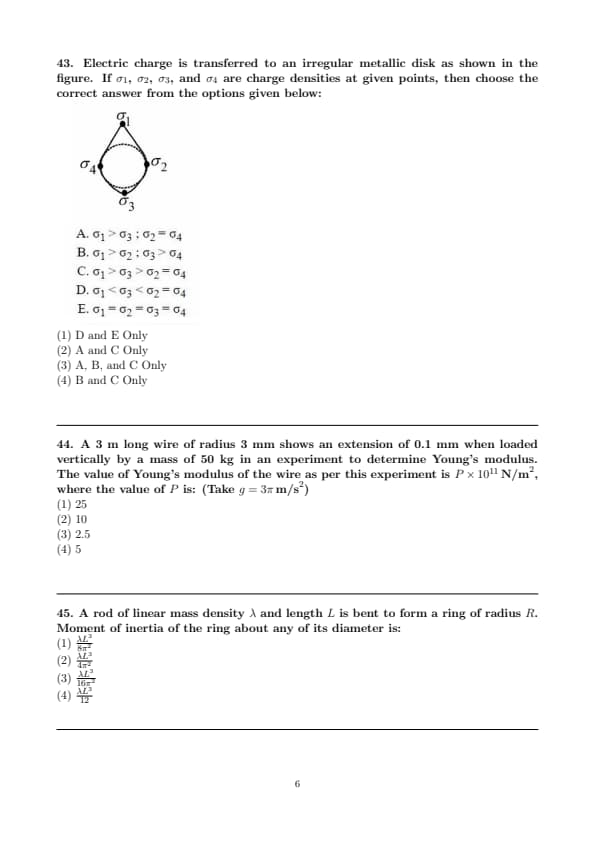 Electric charge is transferred to an irregular metallic disk as shown in the figure. If \( \sigma_1 \), \( \sigma_2 \), \( \sigma_3 \), and \( \sigma_4 \) are charge densities at given points, then choose the correct answer from the options given below: