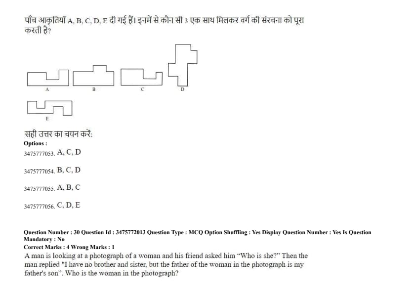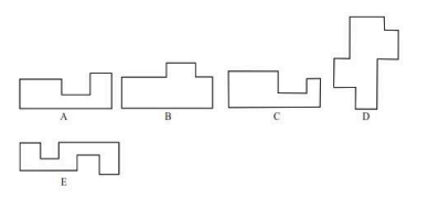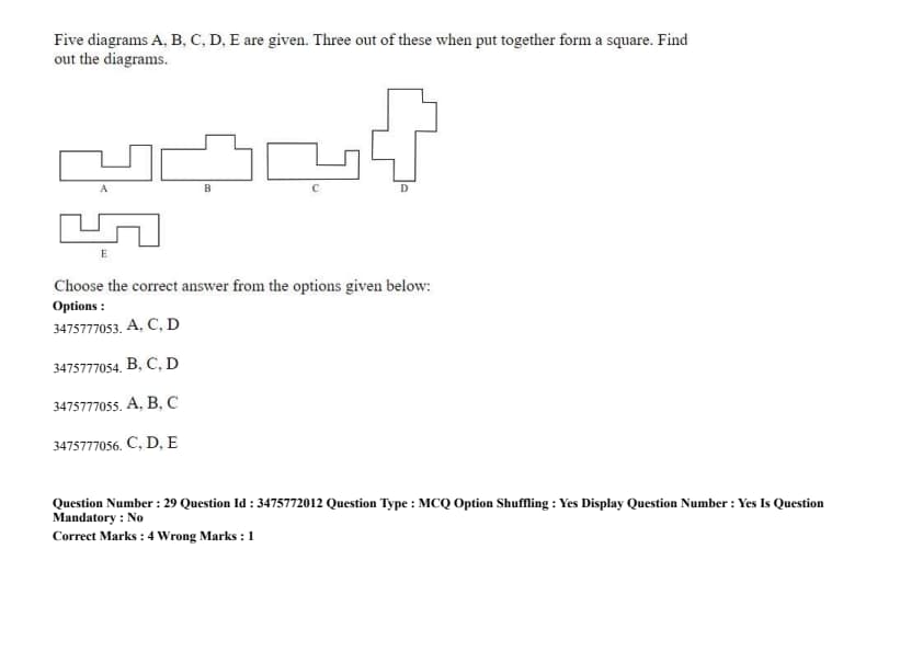 Five diagrams \(A, B, C, D,\) and \(E\) are given. Three out of these, when put together, form a square. Identify the correct set of diagrams.
