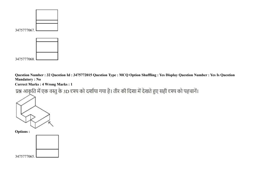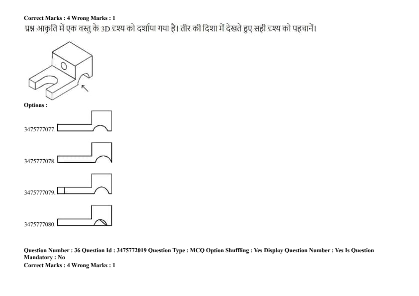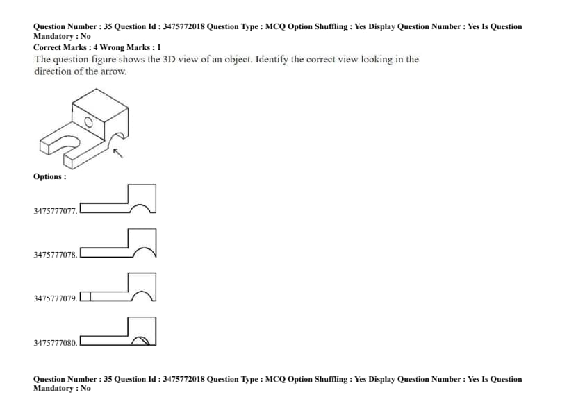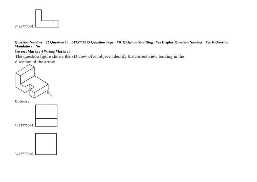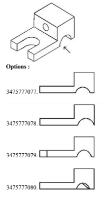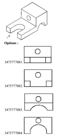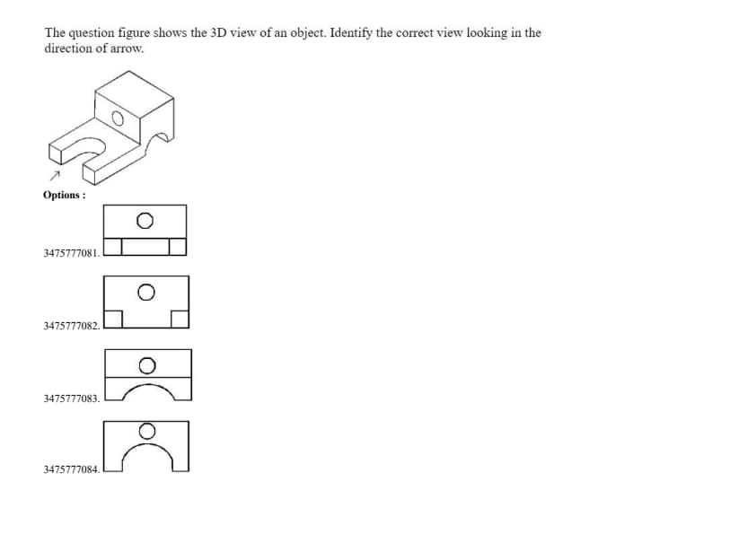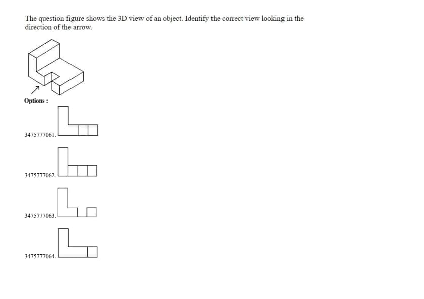 The question figure shows the 3D view of an object. Identify the correct view when looking in the direction of the arrow.