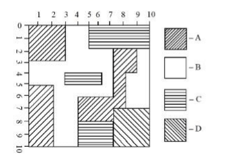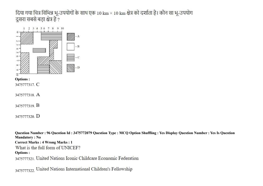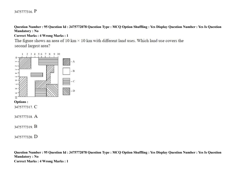 The figure shows an area of \(10 km \times 10 km\) with different land uses. Which land use covers the second largest area?