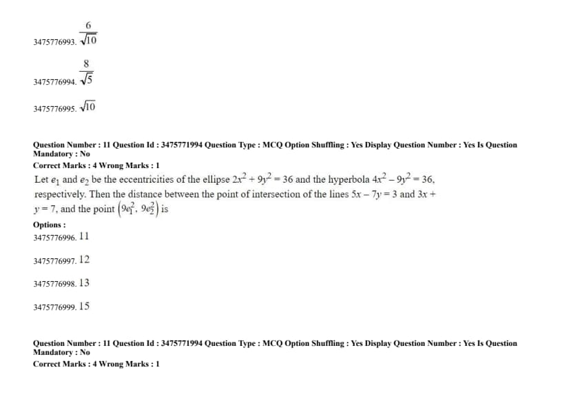 Let \(e_1\) and \(e_2\) be the eccentricities of the ellipse \(2x^2+9y^2=36\) and the hyperbola \(4x^2-9y^2=36\), respectively. Then the distance between the point of intersection of the lines \(5x-7y=3\) and \(3x+y=7\), and the point \( (9e_1^2,\;9e_2^2) \) is: