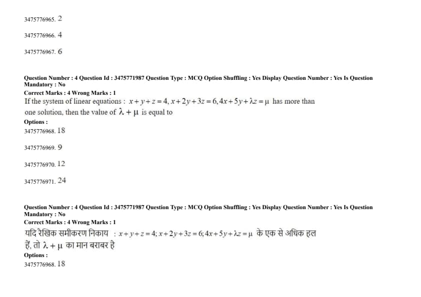 If the system of linear equations : \[ x+y+z=4,\quad x+2y+3z=6,\quad 4x+5y+\lambda z=\mu \]