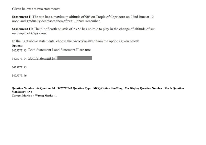 Statement I: The sun has a maximum altitude of \(90^\circ\) on the Tropic of Capricorn on 22nd June at 12 noon and gradually decreases thereafter till 22nd December.