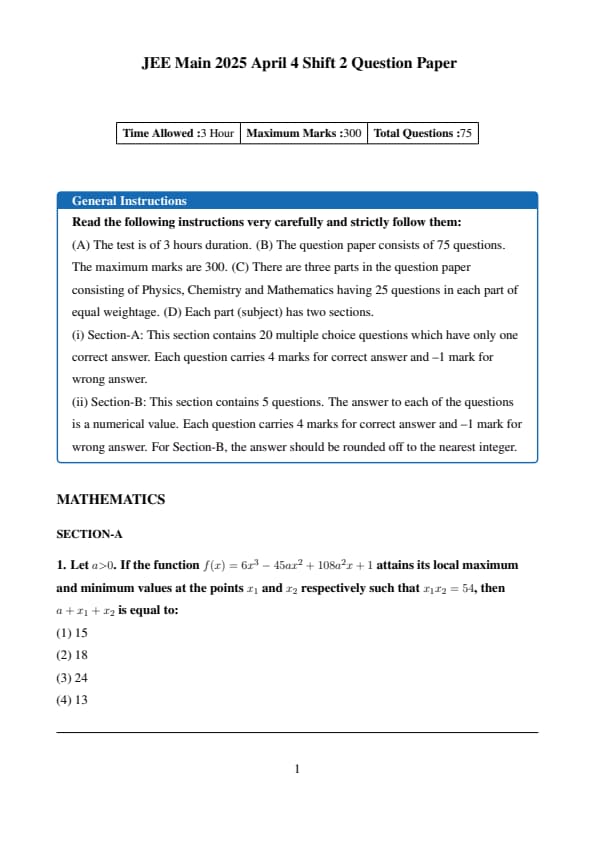 NTA conducted JEE Main 4 April Shift 2 from 3 pm to 6 pm. Question paper with solutions pdf is available here for download. In JEE Main April 4 Shift 2 students were required to attempt 75 questions out of 90 following a marking scheme of +4 for correct answers and -1 for incorrect ones.