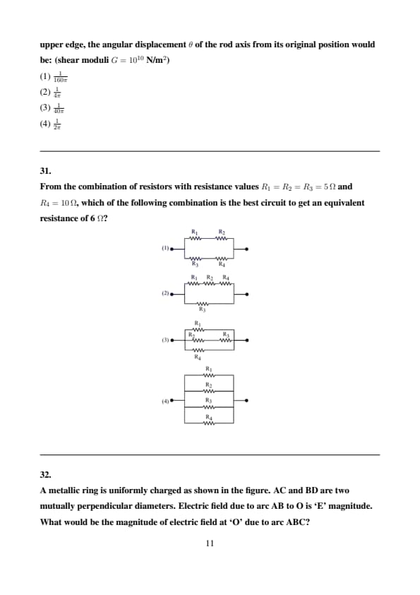 From the combination of resistors with resistance values \( R_1 = R_2 = R_3 = 5 \, \Omega \) and \( R_4 = 10 \, \Omega \), which of the following combination is the best circuit to get an equivalent resistance of 6 \( \Omega \)?