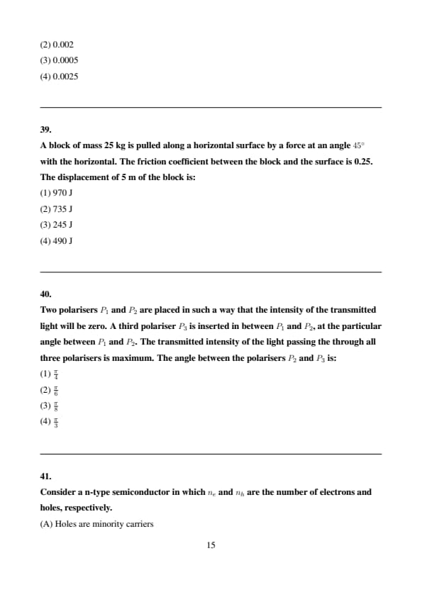 A block of mass 25 kg is pulled along a horizontal surface by a force at an angle \( 45^\circ \) with the horizontal. The friction coefficient between the block and the surface is 0.25. The displacement of 5 m of the block is:
