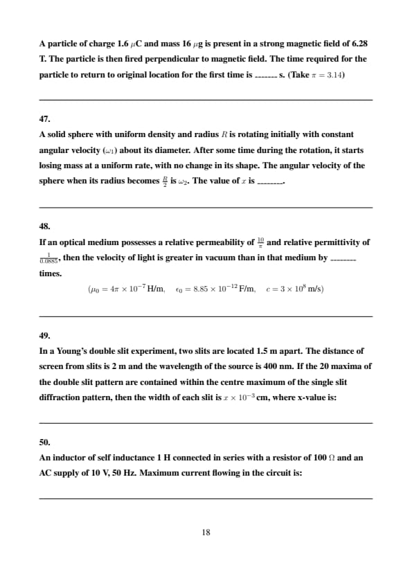 A particle of charge 1.6 \(\mu\)C and mass 16 \(\mu\)g is present in a strong magnetic field of 6.28 T. The particle is then fired perpendicular to magnetic field. The time required for the particle to return to original location for the first time is _______ s. (Take \( \pi = 3.14 \))
