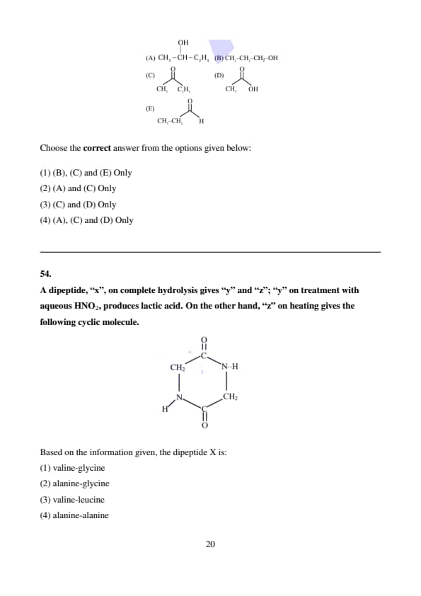 A dipeptide, “x”, on complete hydrolysis gives “y” and “z”; “y” on treatment with aqueous HNO\(_2\), produces lactic acid. On the other hand, “z” on heating gives the following cyclic molecule.