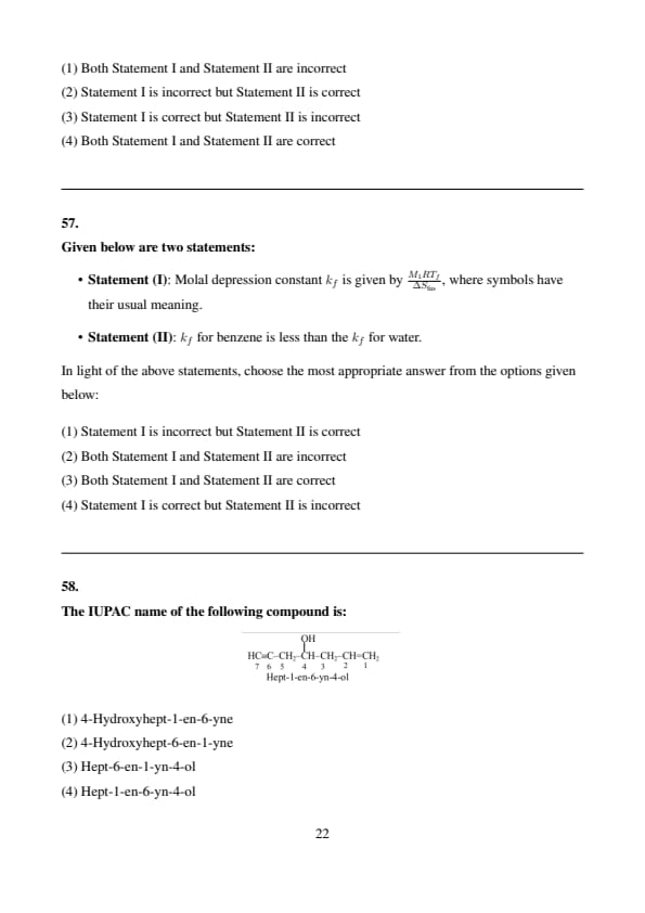 Statement (I): Molal depression constant \( k_f \) is given by \( \frac{M_1 R T_f}{\Delta S_{fus}} \), where symbols have their usual meaning.