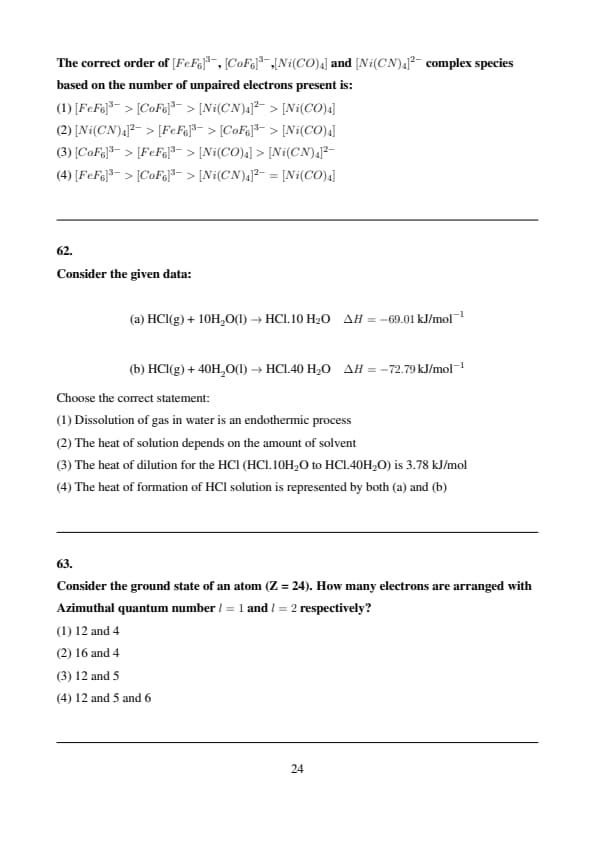 The correct order of \( [FeF_6]^{3-} \), \( [CoF_6]^{3-} \),\( [Ni(CO)_4] \) and \( [Ni(CN)_4]^{2-} \) complex species based on the number of unpaired electrons present is: