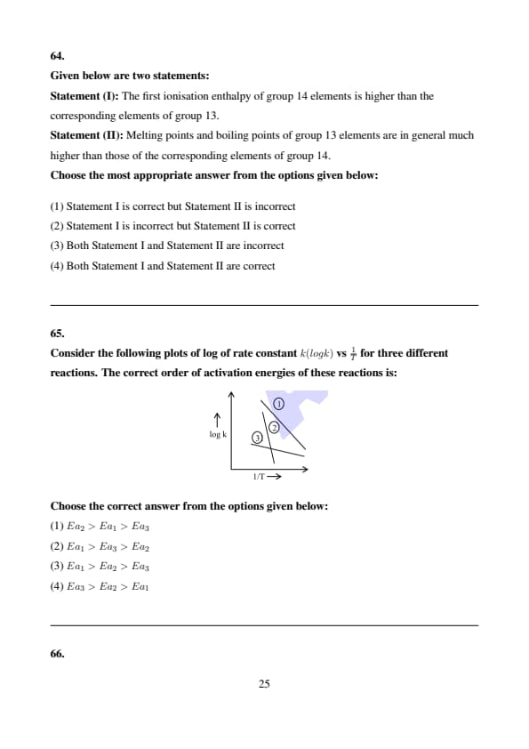 Statement (I): The first ionisation enthalpy of group 14 elements is higher than the corresponding elements of group 13.