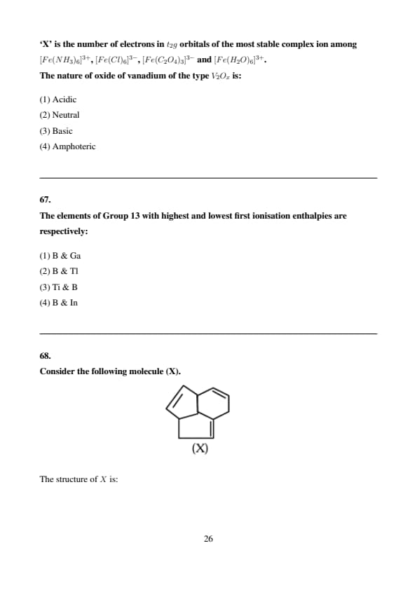 ‘X’ is the number of electrons in \( t_2g \) orbitals of the most stable complex ion among \( [Fe(NH_3)_6]^{3+} \), \( [Fe(Cl)_6]^{3-} \), \( [Fe(C_2O_4)_3]^{3-} \) and \( [Fe(H_2O)_6]^{3+} \).