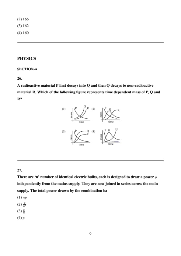 A radioactive material P first decays into Q and then Q decays to non-radioactive material R. Which of the following figure represents time dependent mass of P, Q and R?