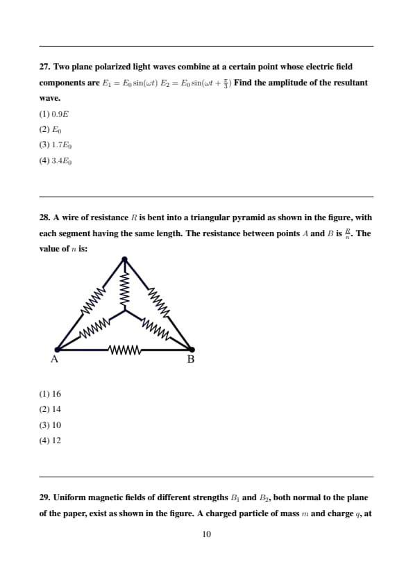 Two plane polarized light waves combine at a certain point whose electric field components are \( E_1 = E_0 \sin(\omega t) \) \( E_2 = E_0 \sin(\omega t + \frac{\pi}{3}) \)