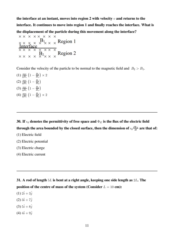 Uniform magnetic fields of different strengths \( B_1 \) and \( B_2 \), both normal to the plane of the paper, exist as shown in the figure. A charged particle of mass \( m \) and charge \( q \), at the interface at an instant, moves into region 2 with velocity \( v \) and returns to the interface. It continues to move into region 1 and finally reaches the interface. What is the displacement of the particle during this movement along the interface?