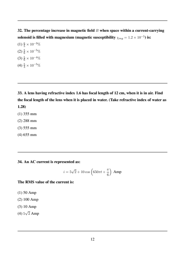 The percentage increase in magnetic field \( B \) when space within a current-carrying solenoid is filled with magnesium (magnetic susceptibility \( \chi_{mg} = 1.2 \times 10^{-5} \)) is:
