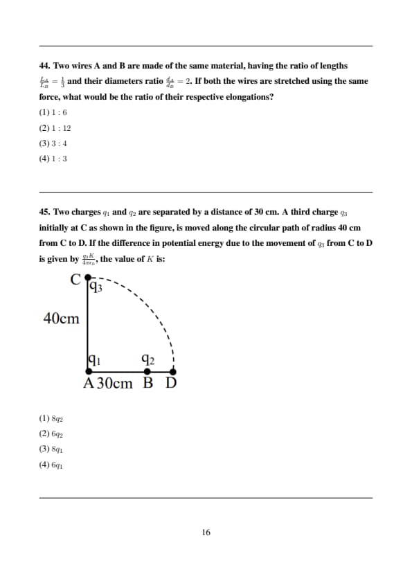 Two wires A and B are made of the same material, having the ratio of lengths \( \frac{L_A}{L_B} = \frac{1}{3} \) and their diameters ratio \( \frac{d_A}{d_B} = 2 \). If both the wires are stretched using the same force, what would be the ratio of their respective elongations?