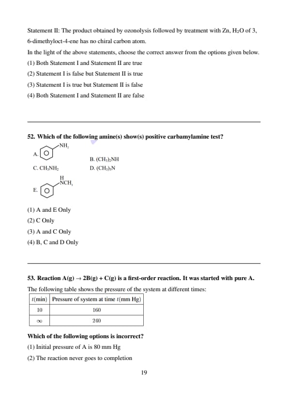 Statement II: The product obtained by ozonolysis followed by treatment with Zn, H\(_2\)O of 3, 6-dimethyloct-4-ene has no chiral carbon atom.