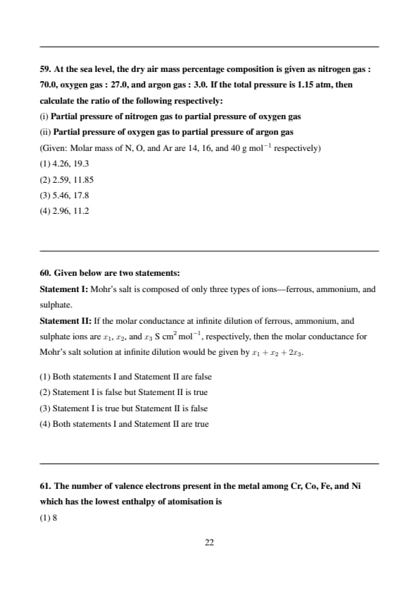 Statement II: If the molar conductance at infinite dilution of ferrous, ammonium, and sulphate ions are \( x_1 \), \( x_2 \), and \( x_3 \) \( S cm^2 \, mol^{-1} \), respectively, then the molar conductance for Mohr's salt solution at infinite dilution would be given by \( x_1 + x_2 + 2x_3 \).
