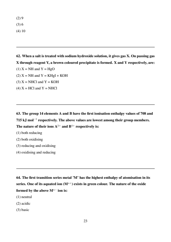 The first transition series metal 'M' has the highest enthalpy of atomisation in its series. One of its aquated ion (M\(^{n+}\)) exists in green colour. The nature of the oxide formed by the above M\(^{n-}\) ion is: