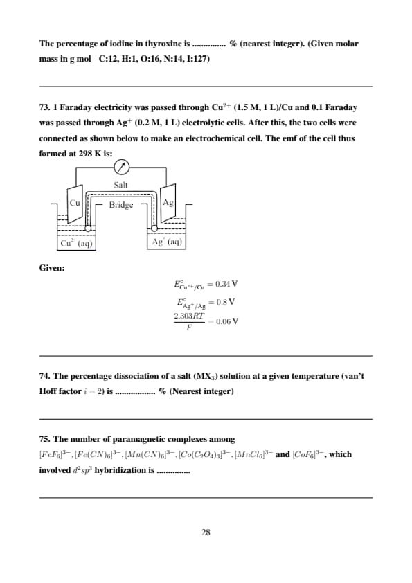 Given: \[ E^\circ_{Cu^{2+}/Cu} = 0.34 \, V \] \[ E^\circ_{Ag^+/ Ag} = 0.8 \, V \] \[ \frac{2.303RT}{F} = 0.06 \, V \]