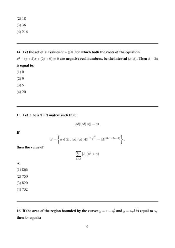 Let the set of all values of \( p \in \mathbb{R} \), for which both the roots of the equation \( x^2 - (p + 2)x + (2p + 9) = 0 \) are negative real numbers, be the interval \( (\alpha, \beta) \). Then \( \beta - 2\alpha \) is equal to: