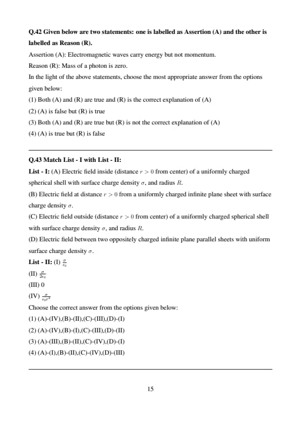 Match List - I with List - II: List - I: (A) Electric field inside (distance \( r > 0 \) from center) of a uniformly charged spherical shell with surface charge density \( \sigma \), and radius \( R \). (B) Electric field at distance \( r > 0 \) from a uniformly charged infinite plane sheet with surface charge density \( \sigma \). (C) Electric field outside (distance \( r > 0 \) from center) of a uniformly charged spherical shell with surface charge density \( \sigma \), and radius \( R \). (D) Electric field between two oppositely charged infinite plane parallel sheets with uniform surface charge density \( \sigma \). List - II: (I) \( \frac{\sigma}{\epsilon_0} \) (II) \( \frac{\sigma}{2\epsilon_0} \) (III) 0 (IV) \( \frac{\sigma}{\epsilon_0 r^2} \) Choose the correct answer from the options given below: