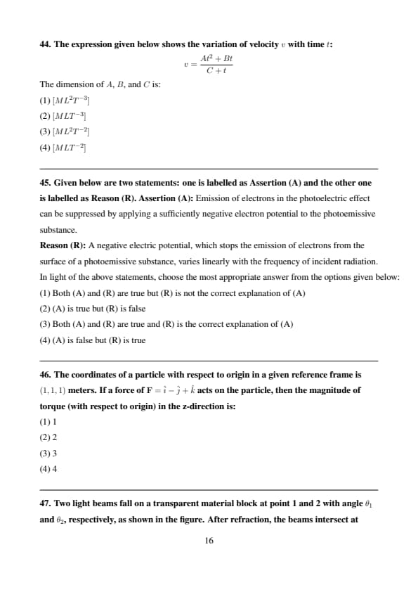 The expression given below shows the variation of velocity \( v \) with time \( t \): \[ v = At^2 + \frac{Bt}{C + t}. \] The dimension of \( ABC \) is: