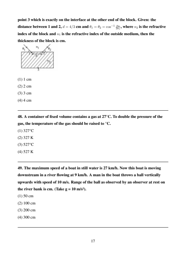 Two light beams fall on a transparent material block at point 1 and 2 with angle \( \theta_1 \) and \( \theta_2 \), respectively, as shown in the figure. After refraction, the beams intersect at point 3 which is exactly on the interface at the other end of the block. Given: the distance between 1 and 2, \( d = \frac{4}{3} \) cm and \( \theta_1 = \theta_2 = \cos^{-1} \left( \frac{n_2}{2n_1} \right) \), where \( n_2 \) is the refractive index of the block and \( n_1 \) is the refractive index of the outside medium, then the thickness of the block is _____ cm.