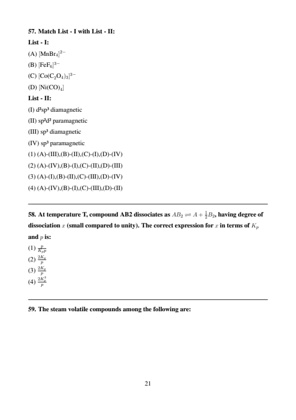 List - II: (I) \( d^2sp^3 \) & diamagnetic