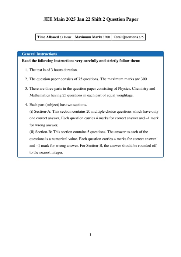 JEE Main 2025 22nd Jan Shift 2 Question Paper is available for download. NTA conducted the exam successfully on 22nd Jan 2025 from 03:00 PM to 06:00 PM. The JEE Main 2025 22nd Jan Shift 2 Question Paper is expected to be Moderately tough. A comprehensive paper analysis including subject-wise question breakdown will be added in due time.