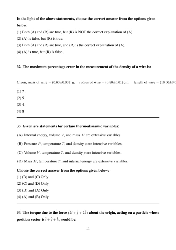 The maximum percentage error in the measurement of the density of a wire is: \[ \text{Given, mass of wire} = (0.60 \pm 0.003) \, \text{g}, \quad \text{radius of wire} = (0.50 \pm 0.01) \, \text{cm}, \quad \text{length of wire} = (10.00 \pm 0.05) \, \text{cm}. \]
