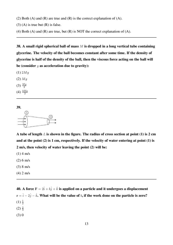 A tube of length \( L \) is shown in the figure. The radius of cross section at point (1) is 2 cm and at the point (2) is 1 cm, respectively. If the velocity of water entering at point (1) is 2 m/s, then velocity of water leaving the point (2) will be: