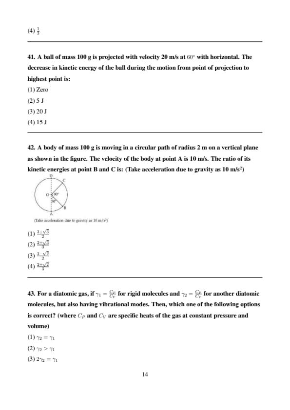 A ball of mass 100 g is projected with velocity 20 m/s at \( 60^\circ \) with horizontal. The decrease in kinetic energy of the ball during the motion from point of projection to highest point is: